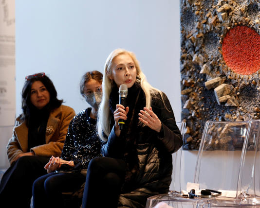 베네치아 전광영 개인전 폐막 행사에서 발언하고 있는 멜리사 추 미국 허시혼미술관장. 뒤로는 전광영의 한지 부조 작품이 보인다. /CKY스튜디오© 제공: 조선일보