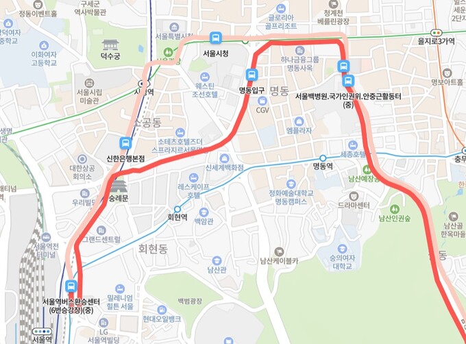 명동입구를 지나는 광역버스는 서울역에서 회차해 명동입구를 거쳐 남산터널로 서울을 빠져나간다. 명동입구 정류장에서 시작된 정체는 서울역까지 영향을 미친다. 네이버 지도 캡처