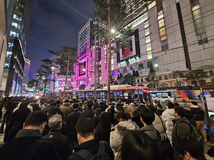 전날 오후 5시30분부터 7시까지 살펴본 명동입구 정류장의 모습은 정체의 연속이었다. 5시30분부터 7시까진 사람들이 계속 늘어났고 버스를 기다리는 시민들로 보행길이 꽉 차면서 양방행 통행을 하기도 어려울 정도였다. 정류장을 지나가던 사람들은 지인에게 “여기 원래 이랬냐”, “이거 무슨 줄이냐”, “무슨 일이 있는 것이냐”고 묻기도 했다.