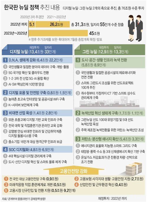 한국판 뉴딜은 △디지털 뉴딜 △그린 뉴딜 △휴먼(고용안정) 뉴딜 등 2+1개 축으로 구성된다. 7개 분야 총 25개 핵심 프로젝트에 2025년까지 총 76조원을 투자한다.